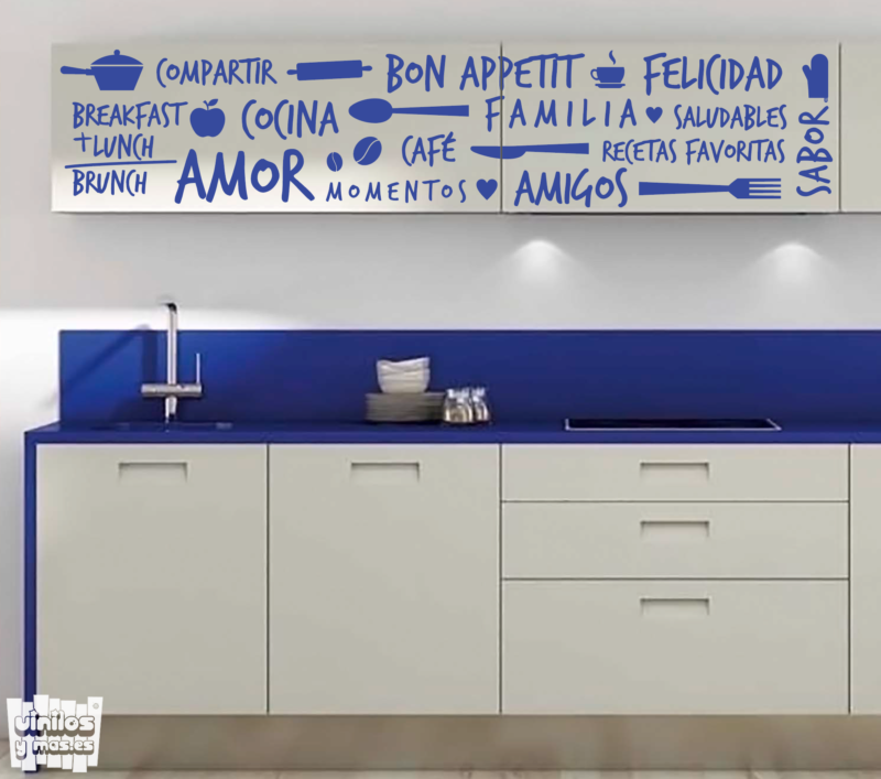 Vinilo decorativo palabras cocina «compartir, cocina, amor, cafe, momentos, familia, amigos, felicidad, sabor, recetas favoritas, saludables, breakfast, lunch, brunch…»